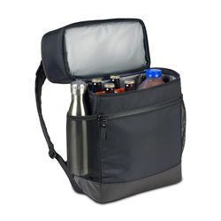 Dual zippered opening to main compartment. Top compartment with dual zippered opening. Dual side mesh pockets for water bottles and belongings. Carabineer bottle opener attached for on-the-go use. Base is wipeable, coated material. Front zippered pocket for additional storage. Padded back panel for comfortable carrying. Padded, adjustable shoulder straps. Top grab handle. EPPE heat-sealed lining. PVC free. Phthalate free. 28 can capacity.